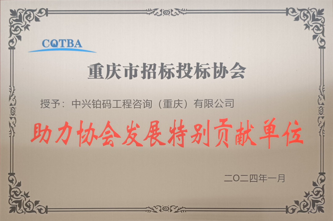 2024年1月,中兴铂码重庆公司荣获重庆市招标投标协会颁发的“助力协会发展特别贡献单位”荣誉称号。这一殊荣是对我司积极参与协会发展的充分肯定。